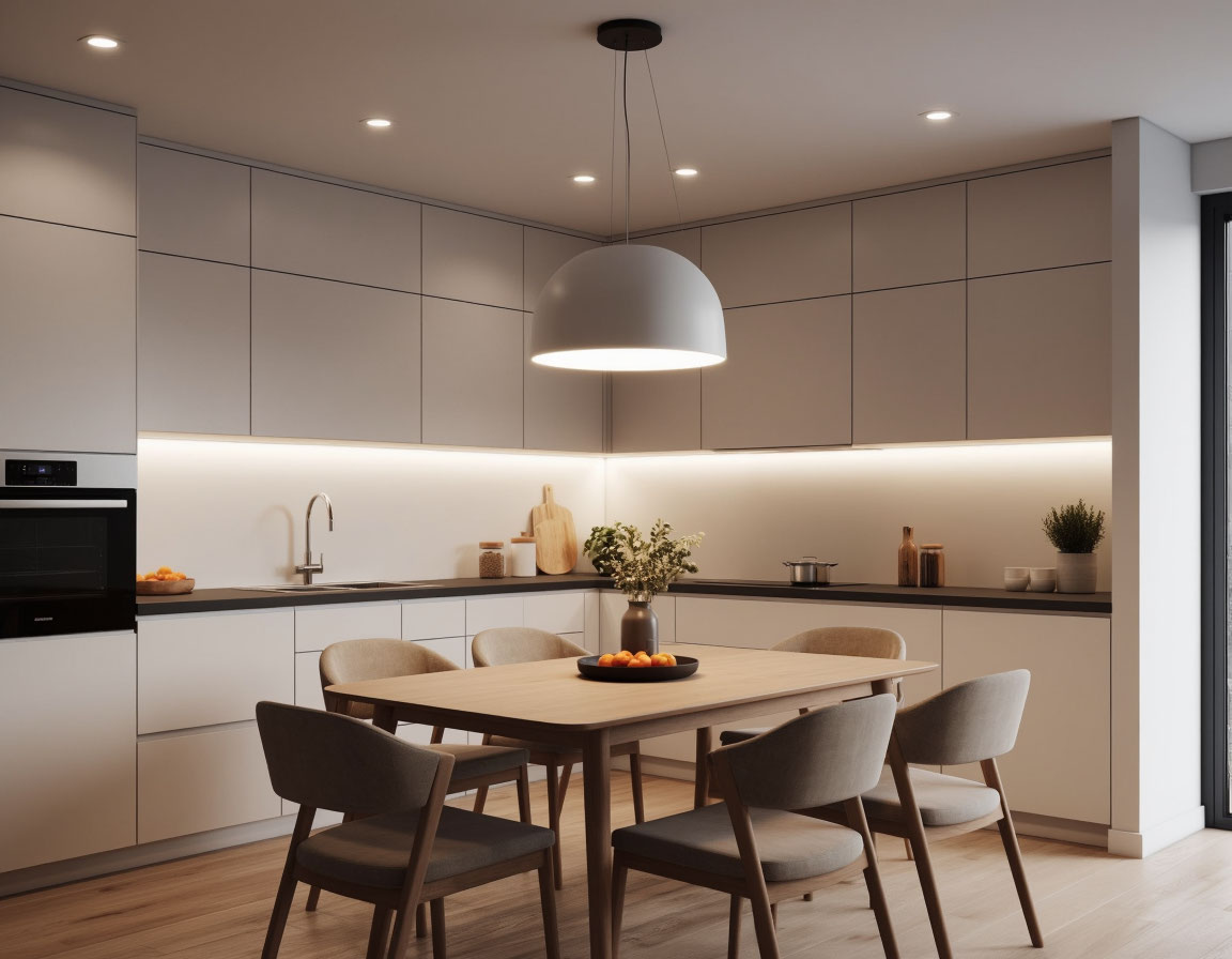 Обеденная зона — подвесной светильник над столом с тёплым светом ().