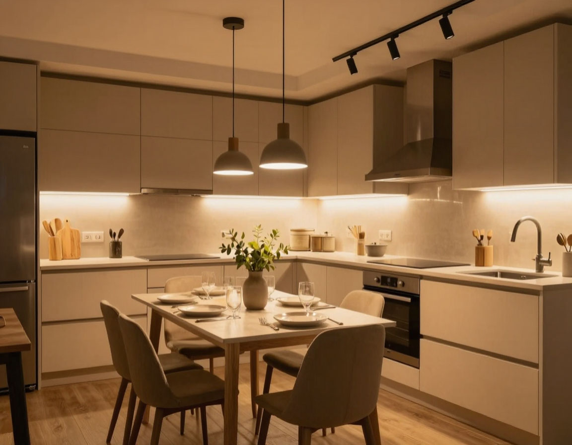 Здесь важно всё: и атмосфера семейных ужинов, и удобство готовки. Решение — многоуровневое освещение:-