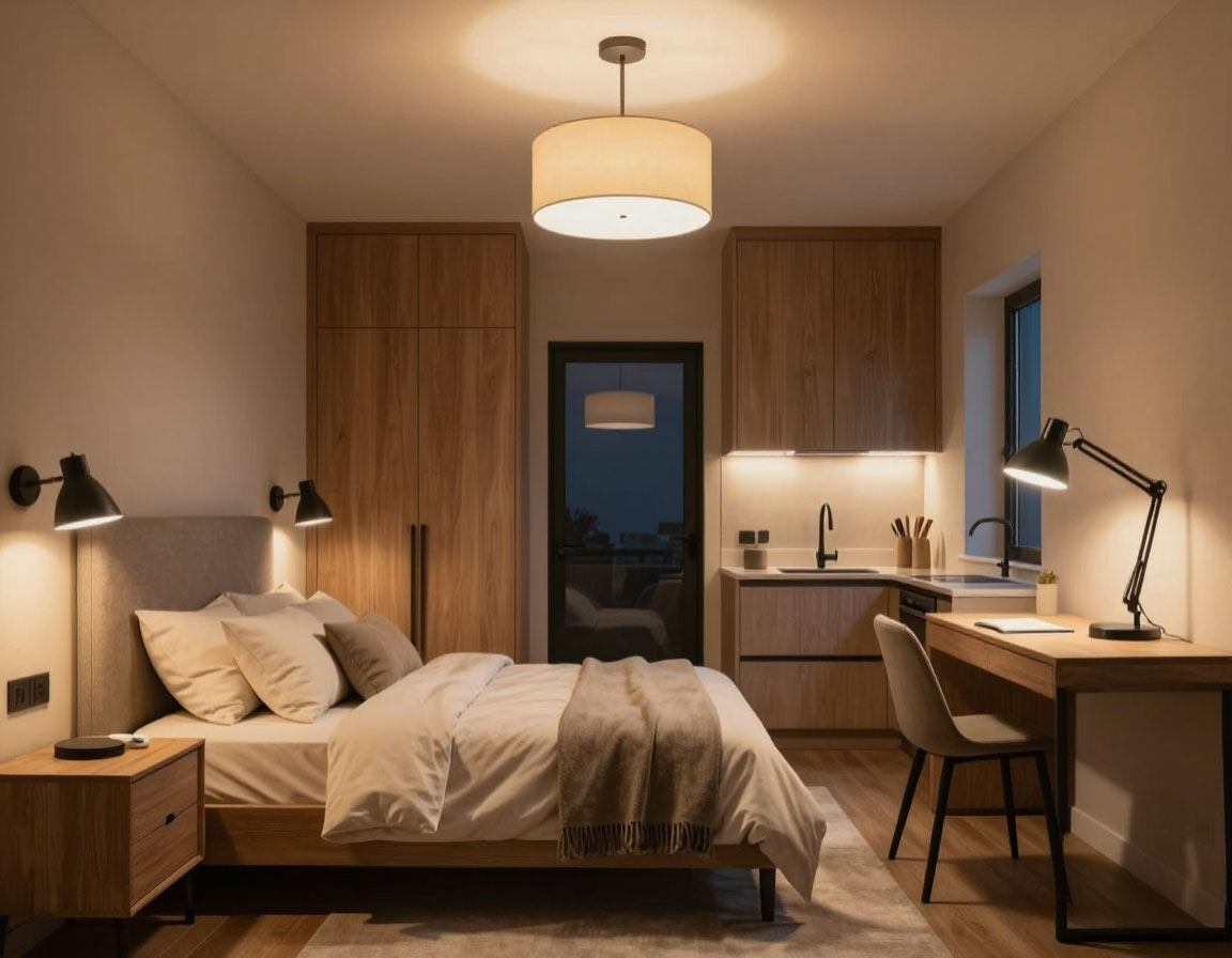 | Спальня | (тёплый) | Настенные бра, прикроватные лампы с диммером |