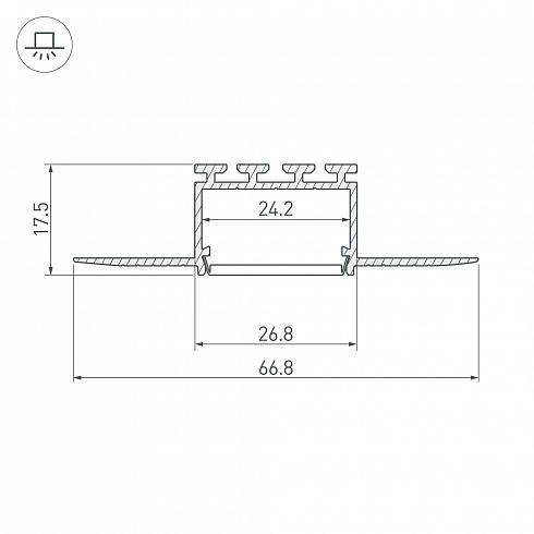 Алюминиевый профиль для светодиодных лент и линеек. Встраиваемый в гипсокартон толщиной 16 мм, под строительную отделку. Позволяет создать линию света шириной 24 мм. без видимых частей алюминия. Габаритные размеры (L×W×H): 3000x66,8x17,5 мм. Ширина площадки для ленты 24,2 мм. Экраны, заглушки и другие аксессуары приобретаются отдельно.