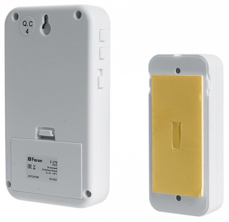 Звонок электрический дверной беспроводной FERON E-379, 18 мелодий, дальность действия 100м, цвет белый, шифрование сигнала - есть; БАЗА: 2*1,5V/AA, 123*70*23 мм, КНОПКА: IP44, 1 * CR2032 (в комплекте) , раб.t -20..+60°С , размер кнопки 38*22*92мм. Беспроводные дверные звонки Feron E-379 артикул 41435 экономичны и просты в установке и эксплуатации. Они идеально подойдут как для квартир и офисов, так и для дач и загородных домов. Установить такие звонки очень просто, достаточно закрепить кнопку двусторонним скотчем на стене перед входной дверью или у калитки, а основной механизм можно разместить в помещении. Преимущества: 18 мелодий на выбор, 4 уровня громкости, радиус действия - до 100 метров, радиочастотный канал позволяет проникать сигналу даже через стены бетонных и кирпичных домов, кодировка сигнала исключает ложные срабатывания звонка.